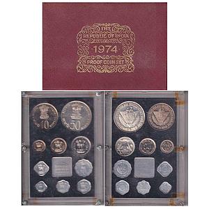Republic India 1974 AD Proof Set Planned Families - Food for All Set of 10 Rupee 50 10 1 and 50 paise 25 paise 10 paise 5 paise 3 paise 2 paise and 1 paisa