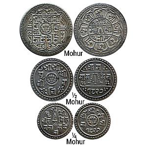 Nepal Shah Dynasty Prithvi Bir Bikram SE 1827 Set of 3 Coins Silver 1 Mohur & 1/2 Mohurs & 1/4 Mohurs