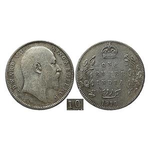 British India Edward VII 1910 AD Bombay Mint "B" incuse with dot on the vine and 10 over 09 in date Silver Rupee